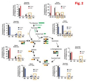 Such findings suggest that blocking glutamine metabolism can critically disrupt the metabolism of the tumor as a whole, with marked effects on the nutrient milieu within the TME. More interestingly, our results indicate that blockade of glutamine metabolism in tumor, does not metabolically disable antitumor immune cells, and appears to robustly enhance their function and effectiveness. Based on this finding, we hypothesized that T cells used an alternative anaplerotic source to maintain TCA activity. To test this, we performed a series of in vitro stable-isotope tracing studies, we found that drug-treated MC38 tumor cells show a profound suppression of glucose-derived carbons contributing to the TCA cycle. In contrast, drug treated T cells show considerable flexibility in glucose metabolism, glucose-derived carbons, both as acetyl-CoA as well as oxaloacetate through PC-mediated anaplerosis (Fig. 2).