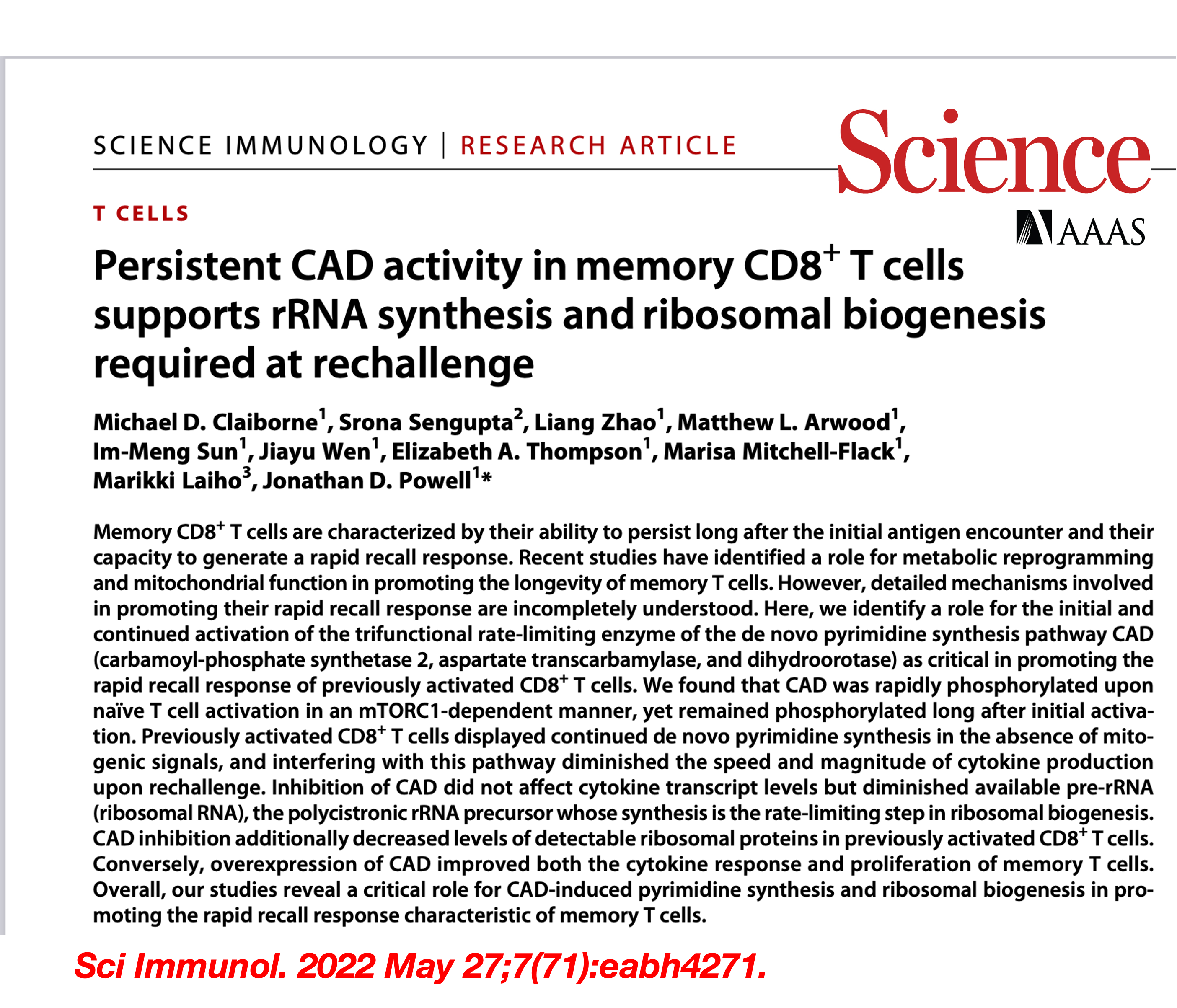 • Persistent CAD activity in memory CD8+ T cells supports rRNA synthesis and ribosomal biogenesis required at rechallenge.September 29, 2017